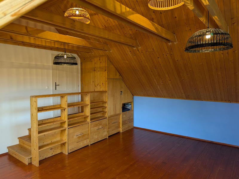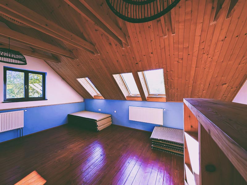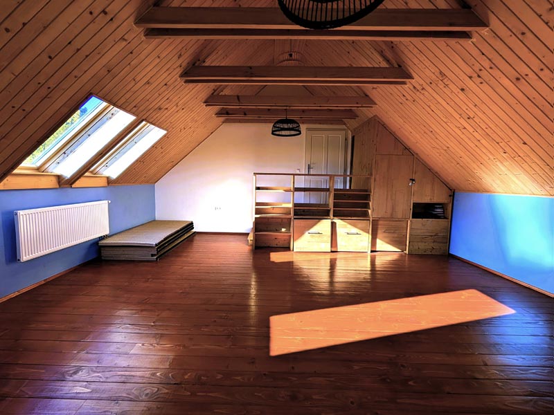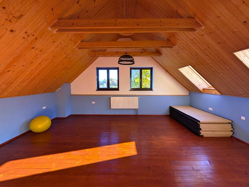 Na Zátiší máme aj niečo, čo na chalupách bežne nenájdete – „telocvičňu“. Veľká miestnosť s drevenou podlahou a rozmermi približne 5 × 6,5 m je vhodná napríklad na cvičenie jogy alebo na skupinové meditácie, ale aj na iné aktivity.